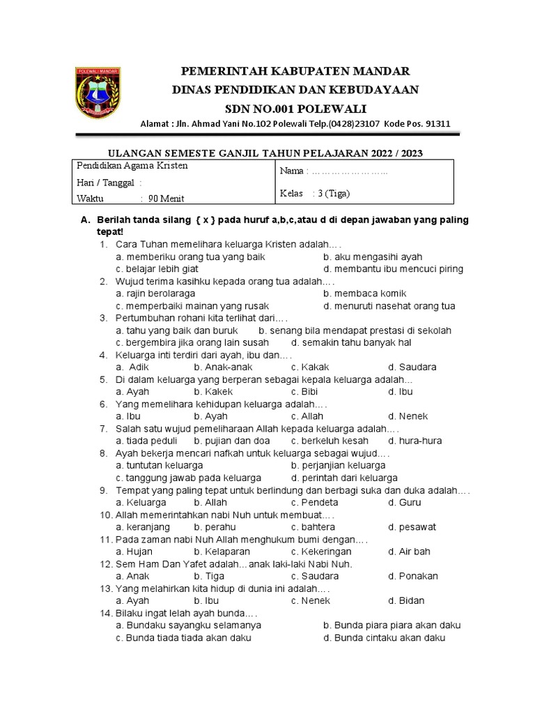 Ujian Akhir Semester (UAS) merupakan momen penting bagi siswa kelas 3 untuk mengukur pemahaman mereka terhadap materi yang telah dipelajari selama satu semester. Mata pelajaran Agama Islam memiliki peran krusial dalam membentuk karakter dan akhlak mulia siswa. Oleh karena itu, persiapan yang matang sangat diperlukan. Artikel ini akan menyajikan contoh soal UAS Agama Islam semester 1 untuk kelas 3, lengkap dengan pembahasan mendalam yang bertujuan untuk membantu siswa memahami konsep-konsep kunci dan meningkatkan kesiapan mereka menghadapi ujian.